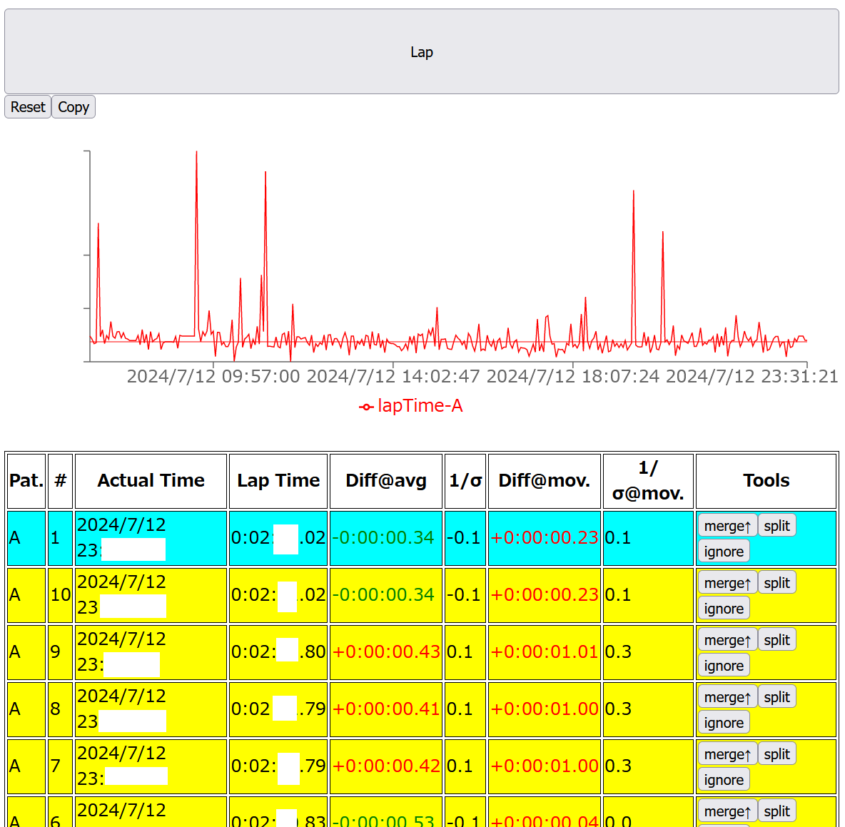 とくに貯めフェーズのお仕事でコミュが発生するたびにタイムがブレるのが、ラップタイムの評価を難しくすることが早期にわかった。お仕事・ライブ1・ライブ2の3フェーズに全体を分け、ライブ1とライブ2の部分では安定していることと、お仕事ではブレの度合いが平均的に収まり続けていることを見ながら、心の安寧を得た。