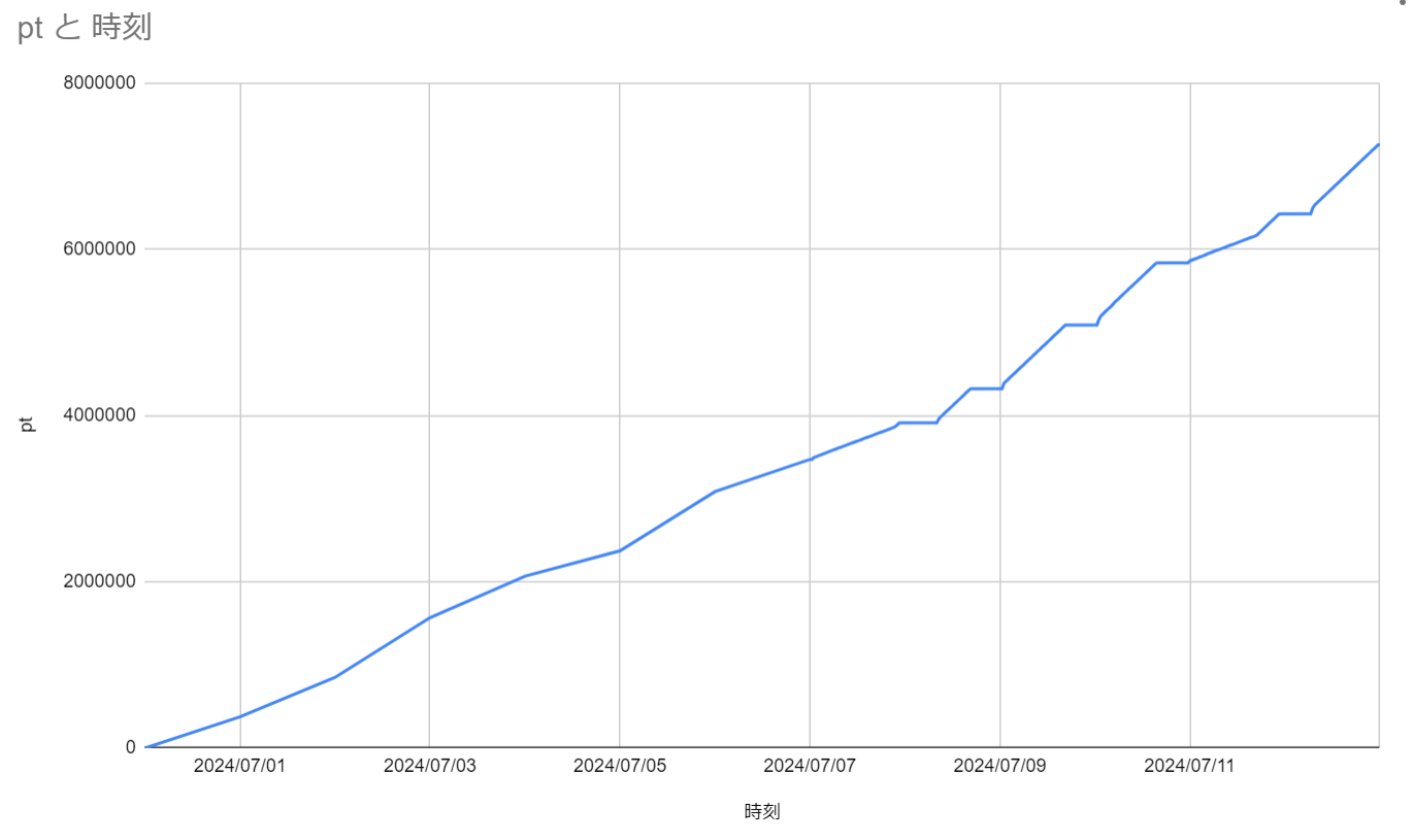 - 22時間稼働した翌日の7/8に1時間45分の寝坊をした。8万点ほどのロス。