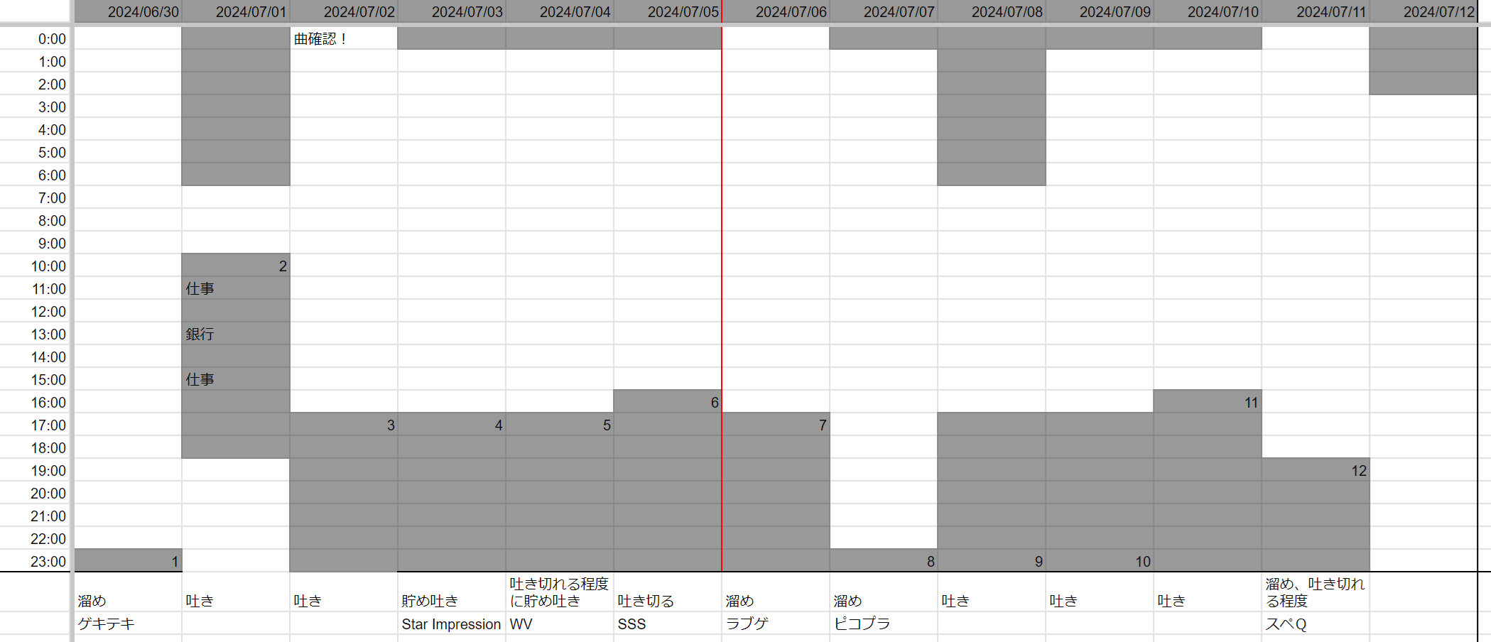 昨年となる6周年では、「5周年の頃程度の稼働で12位ならこれくらいやったら十傑入れるだろ」という舐めプの結果、十傑入りを逃した。7周年イベントでの目標を十傑入りとし、6周年イベント終わった時点で予想される7周年イベント期間の休暇を職場のカレンダーに設定した。